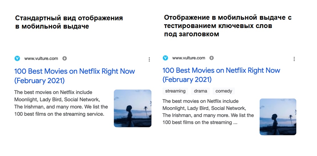 🚦 Google тестирует теги с ключевыми словами в мобильных сниппетах
