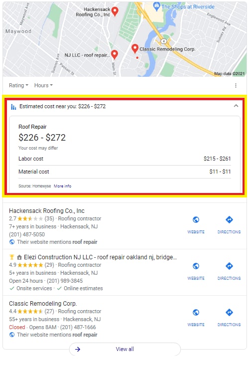 Google тестирует отображение стоимости работ в блоках локальной выдачи пока только в США, оцененной непосредственно на локальной панели в результатах поиска. Информация поступает с Homewyse, независимого справочника, основанного на фактах, для оценки бытовых продуктов, установки и обслуживания.