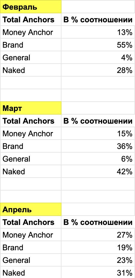 Мы планируем каждый месяц определенное количество ссылок и анкоров. Вот, как получилось у нас за последние 3 месяца. Кол-во ссылок не спалю, а вот % соотношение пожалуйста:)
