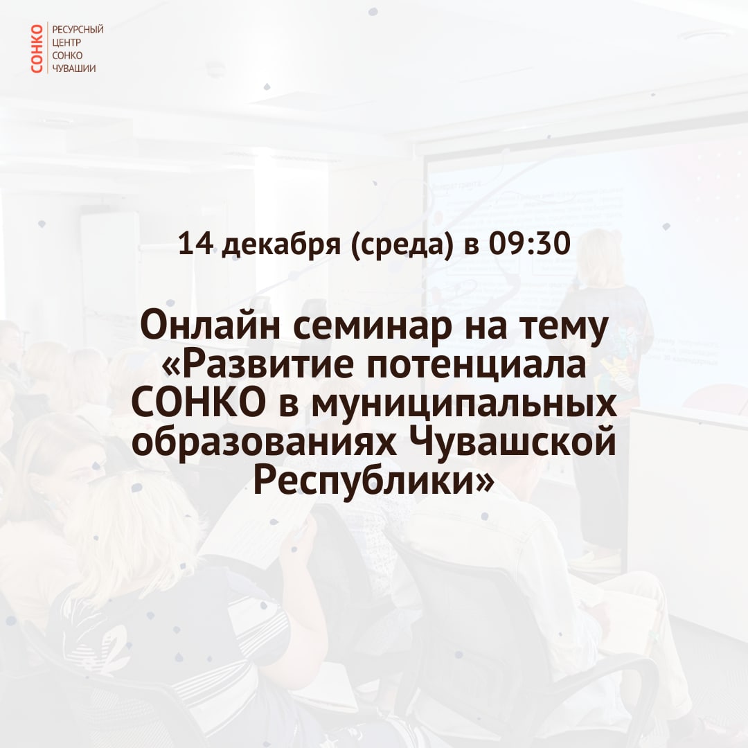 ⚡️14 декабря 2022 года в 09:30 состоится онлайн семинар на тему «Развитие потенциала СОНКО в муниципальных образованиях Чувашской Республики (включая представление результатов анализа муниципальных программ, направленных на поддержку СОНКО в Чувашской Республике)».