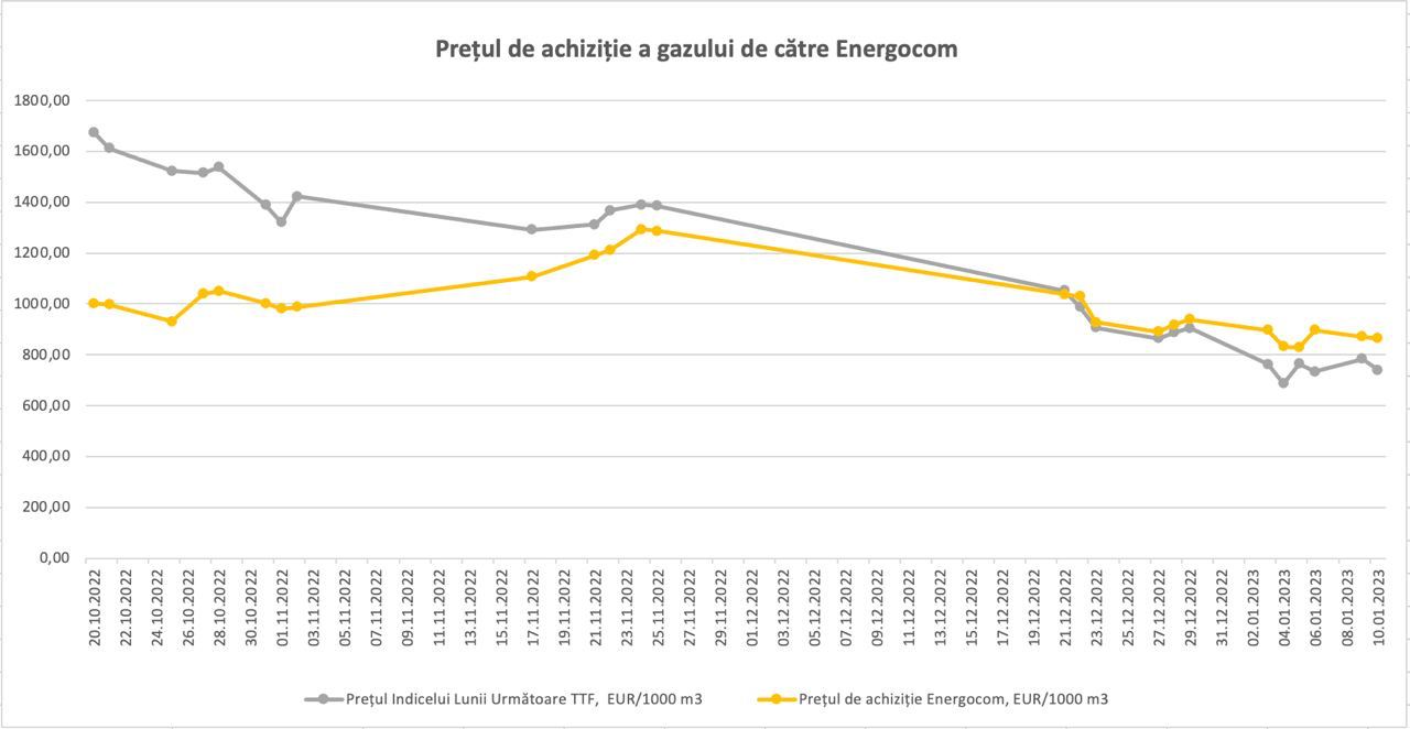 Mai jos, public încă odată graficul cu prețul de pe piață și prețul de achiziție a gazului de către Energocom.