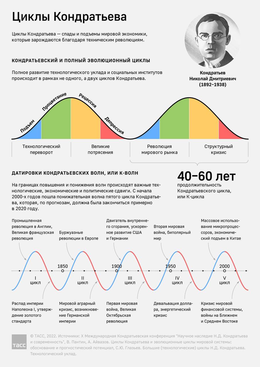 130 лет назад родился Николай Кондратьев — отечественный экономист, выдвинувший в 1920-е годы теорию больших циклов — около 50 лет — развития мировой экономической системы. В своих исследованиях он пришел к выводу, что долговременные изменения экономической конъюнктуры носят циклический характер, где периоды подъема закономерно сменяются спадами, а те вновь — подъемами.