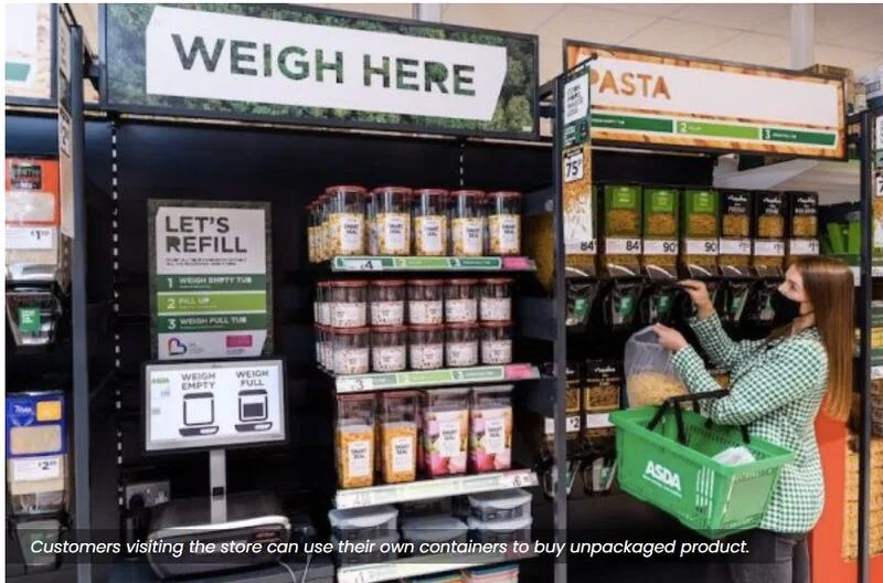 Новый магазин запасных частей Asda находится в Шотландии. Предлагая широкий ассортимент продуктов свободного формата, магазин позволяет покупателям наполнять свои контейнеры, активно стремясь сократить количество пластиковых отходов в продуктовой промышленности. В качестве альтернативы покупатели могут купить многоразовые контейнеры в магазине с той же целью. Супермаркет сотрудничал с множеством самых популярных брендов Великобритании, таких как Kellogg's, Yorkshire Tea, Unilever и Napolina, чтобы обеспечить широкий ассортимент неупакованных товаров.