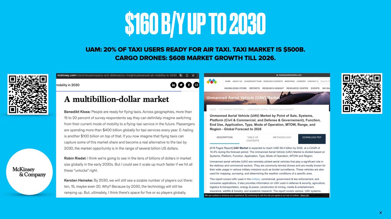 (1) 20% пассажиров такси - готовы пересесть в авиа, чтобы избежать пробок (McKinsey - https://www.mckinsey.com/industries/aerospace-and-defense/our-insights/advanced-air-mobility-in-2030).