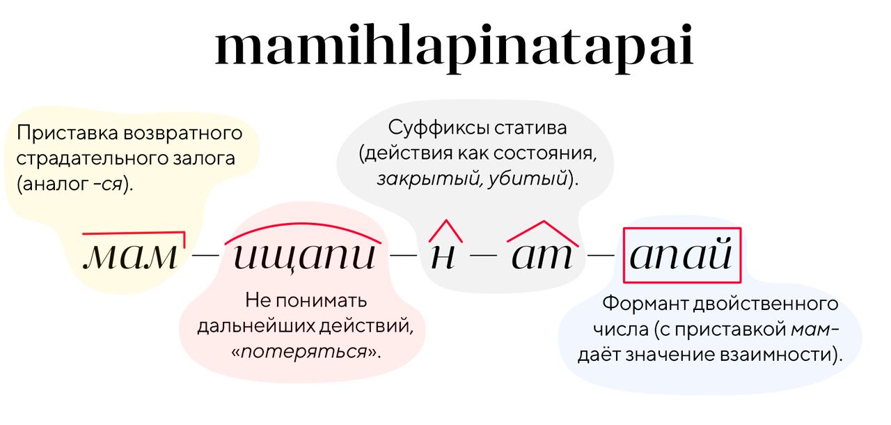 ...и это б вы прочли в любом паблике «Сто фактов». Очень распиаренное слово. Но в реальности — зауряднейшее. В языках малых народностей таких пачки. Их, кстати, любят задавать на лингвистических олимпиадах.