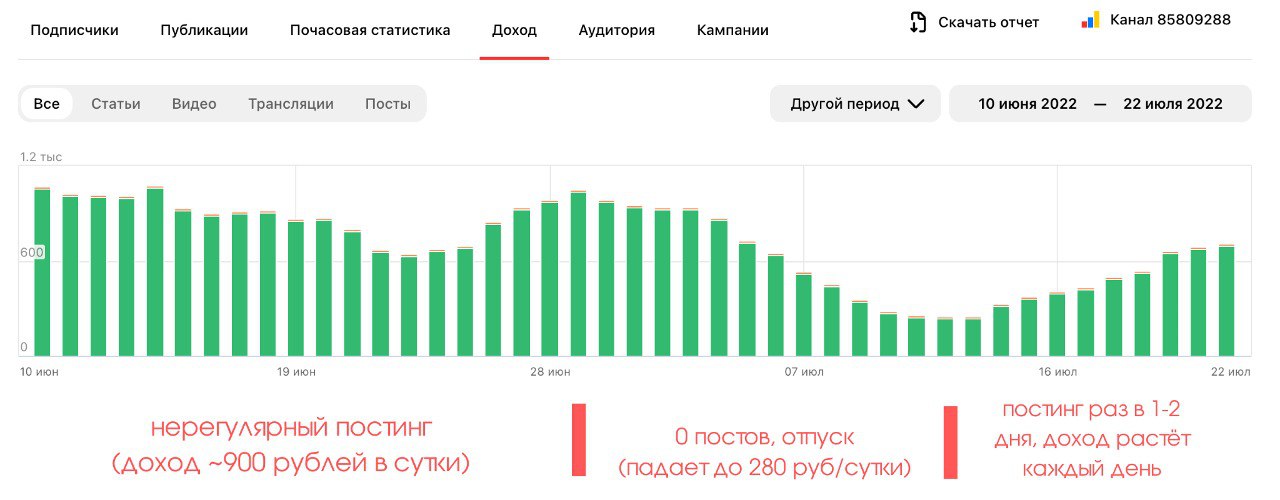 2 недели в начале июля публиковала там звонкое ничего. Соответственно, доход упал до 280 рублей в сутки. С 12 июля публикуюсь каждые день-два. Дошла сейчас до 700 рублей и продолжаю. Хочу понять, какой финансовый максимум можно выжать из регулярного ненапрягающего блогинга, прям по 20-30 минут в день.