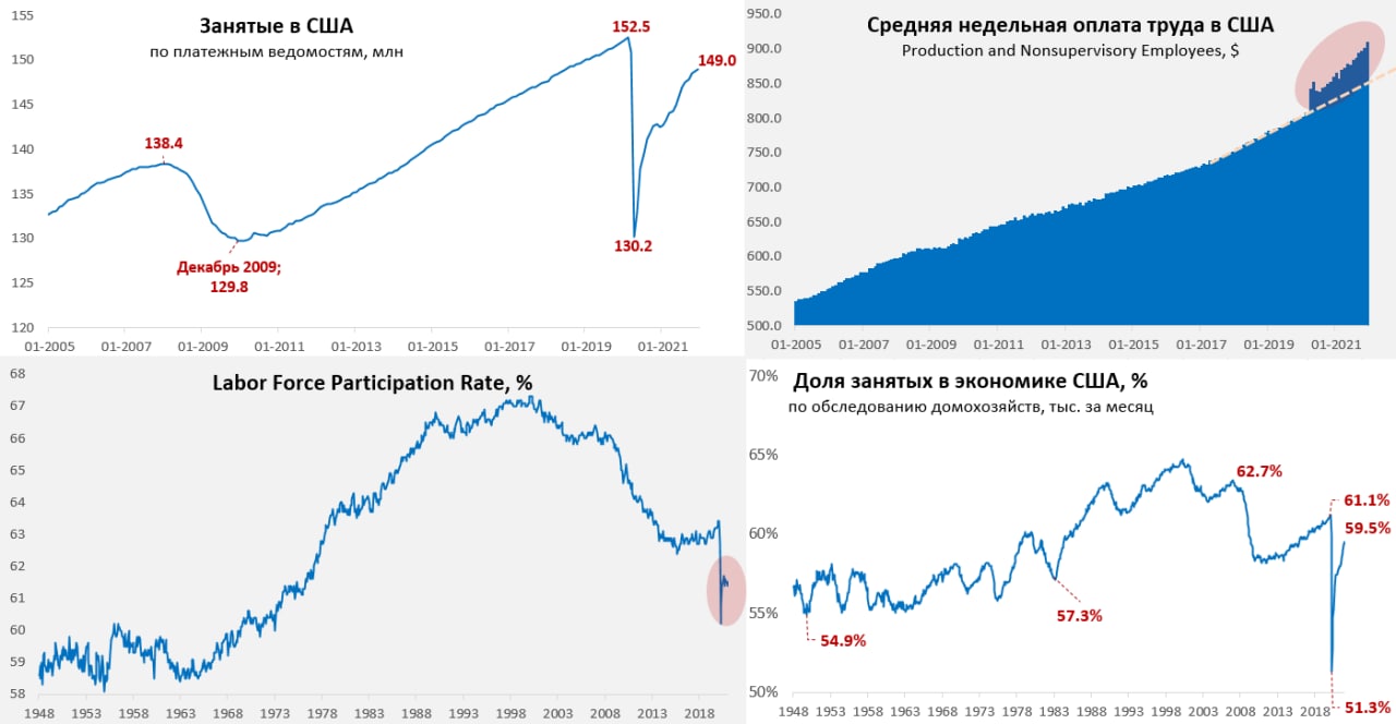 Данные по безработице вышли крайне позитивно, количество безработных сократилось еще на 483 тыс. в декабре, а уровень безработицы снизился до 3.9%, если такими темпами пойдет – то минимумы 1968 года в районе 3.4% будут «переписаны» через несколько месяцев. Доля занятых в США выросла с 59.3% до 59.5%, а вот участие в рабочей силе американцев в этот раз не выросло и составило 61.9%, вполне вероятно, что рынок близок к тому уровню, когда большая часть готовых работать уже вернулась, а оставшиеся будут очень медленно возвращаться к работе, усиливая дефициты.
