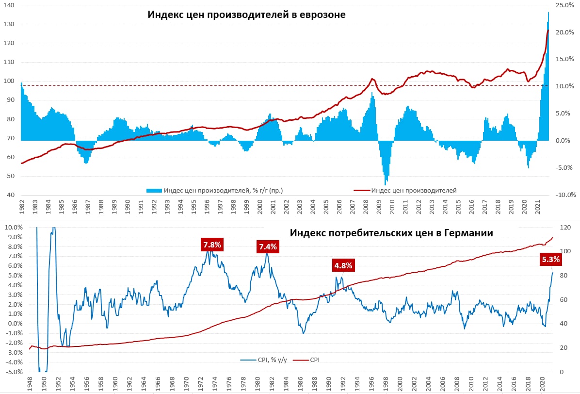 Понятно, что основной драйвер – это энергия, которая подорожала на 3.5% м/м и 66% г/г, но и без энергии цены растут вполне задорно – на 0.9% м/м и 9.8% г/г – рекорд за время существования еврозоны. Производственные цены на потребительские товары и средства производства растут на 3.9% г/г и 4.4% г/г соответственно, но рост здесь только начинает разгоняться. То, что европейский экспорт прилично подорожает в ближайший год сомнений нет.