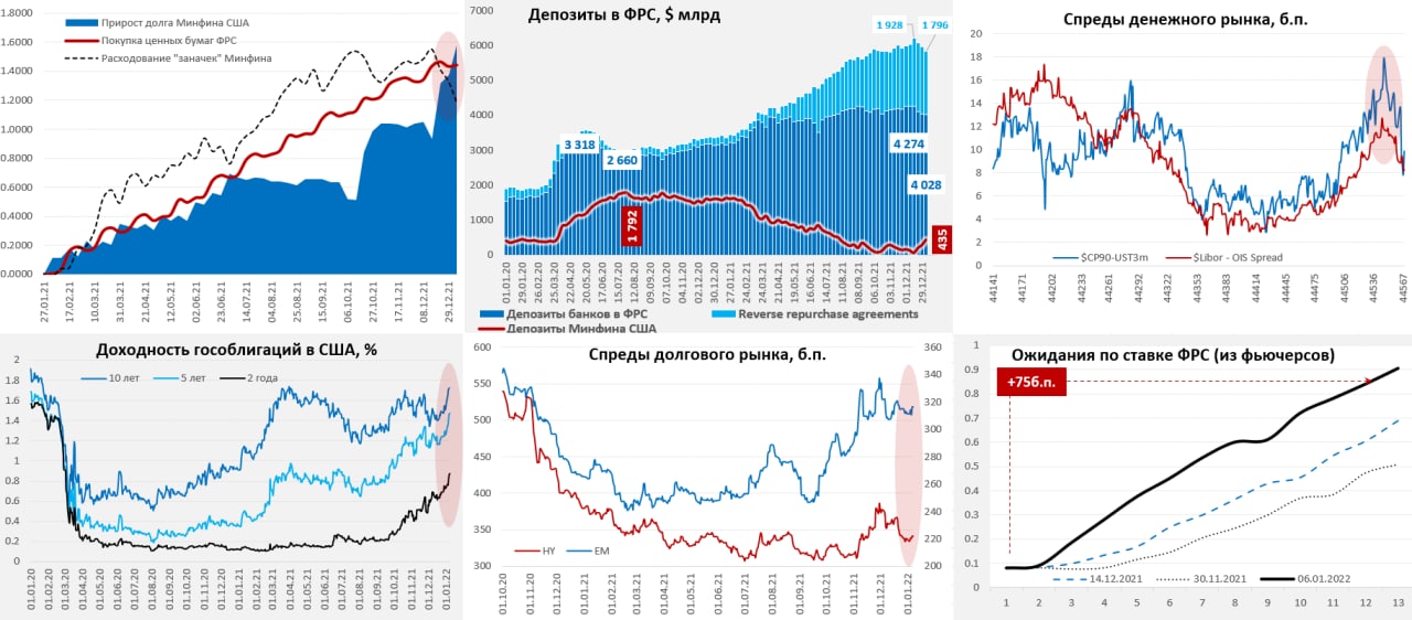 Пока же ФРС продолжает сокращать покупки, купив за последнюю неделю гособлигаций только на $9 млрд, хотя покупки за 4 недели вполне соответствуют планам и составили почти $62 млрд. Значительно более активное движение идет по счетам Минфина США, который за неделю убрал с рынка $150.8 млрд долларов, нарастив свой баланс на неделе до $434.8 млрд, что активно выталкивает доходности по гособлигациям США вверх, ожидания повышения 3 повышений ставок в 2022 году. Спреды долгового рынка пока остаются относительно ровными после некоторого роста в 4 квартале 25-30 б.п. То, что основные процессы происходят в сегменте госдолга – это прямое подтверждение того, что пока основным драйвером процессов выступают операции Минфина США. Но, если ФРС полностью свернет покупки и начнет сокращать баланс, прекратив рефинансирование – она может ежемесячно сокращать баланс на ~$100-150 млрд (из них 2/3 – госдолг и 1/3 ипотека), но, понятно, что она на такое не решится. В этом плане основным для рынка будет решение о том какими темпами ФРС готова будет это делать и в какие сроки. Учитывая, что вероятность повышения ставок в марте сильно выросла, тайминг пока вырисовывается примерно такой: в январе будет указано на ускоренное сворачивание QE (Минфин США как раз завершит свой "тейперинг"), в марте повышение ставки и краткосрочные планы сокращения портфеля …. а, проявив «решительность» в июле ФРС может дать по тормозам… безусловно это при текущих предпосылках по инфляции и инфляционным ожиданиям, а также рынку труда (как раз к весне дефицит рабочей силы здесь может выйти на пики, как и инфляция) и ковиду…