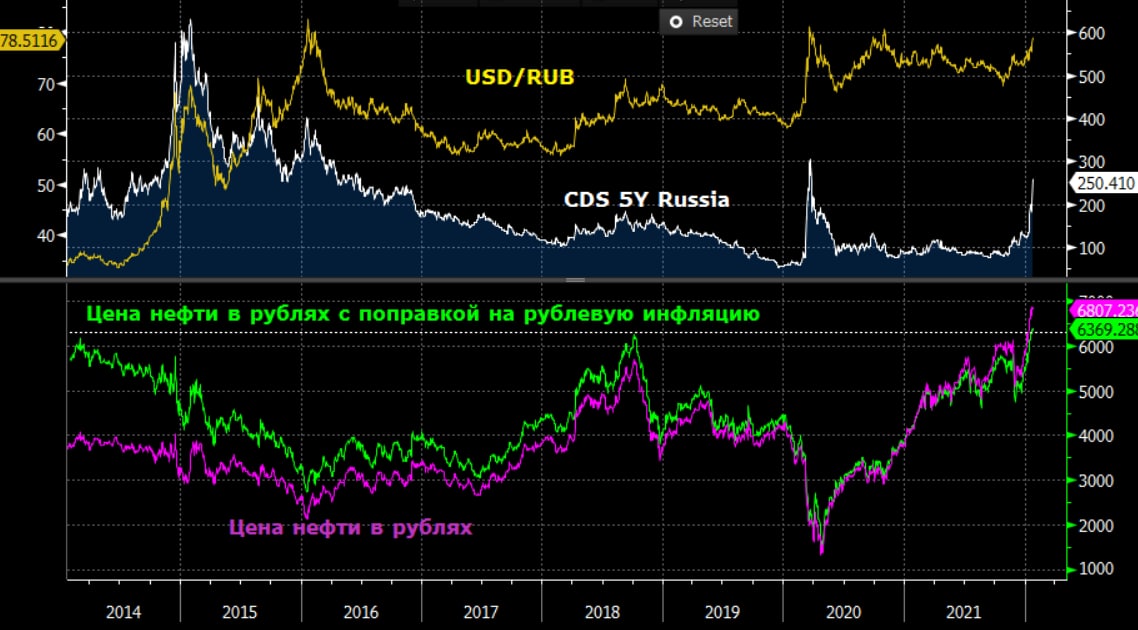 Когда крупные корпоративные российские продавцы валюты ушли с рынка в рубле началась вакханалия (кстати в очередной раз) и курс свозили выше 80 руб./долл., причем не выросли ни CDS Россию, ни доходности ОФЗ, не ушли серьезно даже российские акции... Это говорит о том, что пробой фактически был только в рубле, возможно кто-то крупный из нерезидентов "закрыл" рублевую позицию на фоне объявления о том, что США призвали американцев «срочно покинуть Украину», США передали России «ответ на предложения в сфере безопасности».