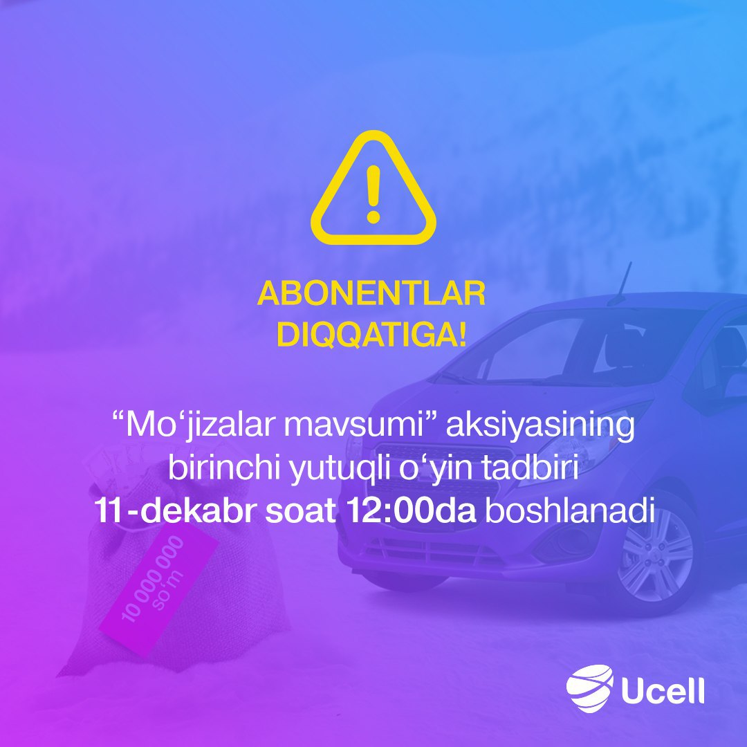 📣 Do‘stlar, “Mo‘jizalar mavsumi” aksiyasi doirasida birinchi yutuqli o‘yin tadbiri 11-dekabr kuni avval aytilganidek saot 17:00da emas, soat 12:00da o‘tkaziladi.