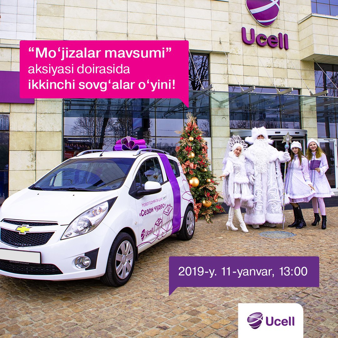 11.01.2019-y. da Ucell Plaza markaziy ofisida "Mo‘jizalar mavsumi" aksiyasining doirasida yana 4 ta 🚘 Spark avtomobili hamda 10 000 000 so‘mdan 🎁 10 ta sovg‘a o‘ynaladi.