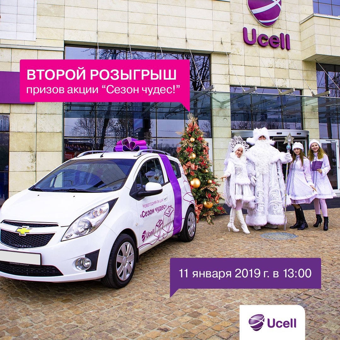 11.01.2019 г. в центральном офисе Ucell Plaza состоится второй розыгрыш в рамках акции «Сезон чудес», где будут разыграны ещё 4 автомобиля 🚘 Spark и 🎁 10 призов по 10 000 000 сумов.⠀