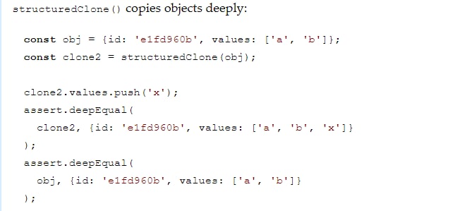 spread оператора есть один существенный недостаток - он создает неглубокие копии (новая ссылка формируется только для объектов верхнего уровня, вложенные объекты копируются по ссылке).structuredClone() - это новая функция, которая скоро будет поддерживаться большинством браузеров, Node.js и Deno. Она создает глубокие копии объектов. В этой статье объясняется, как она работает.Обратите внимание, что эта фича не входит в стандарт ECMAScript.