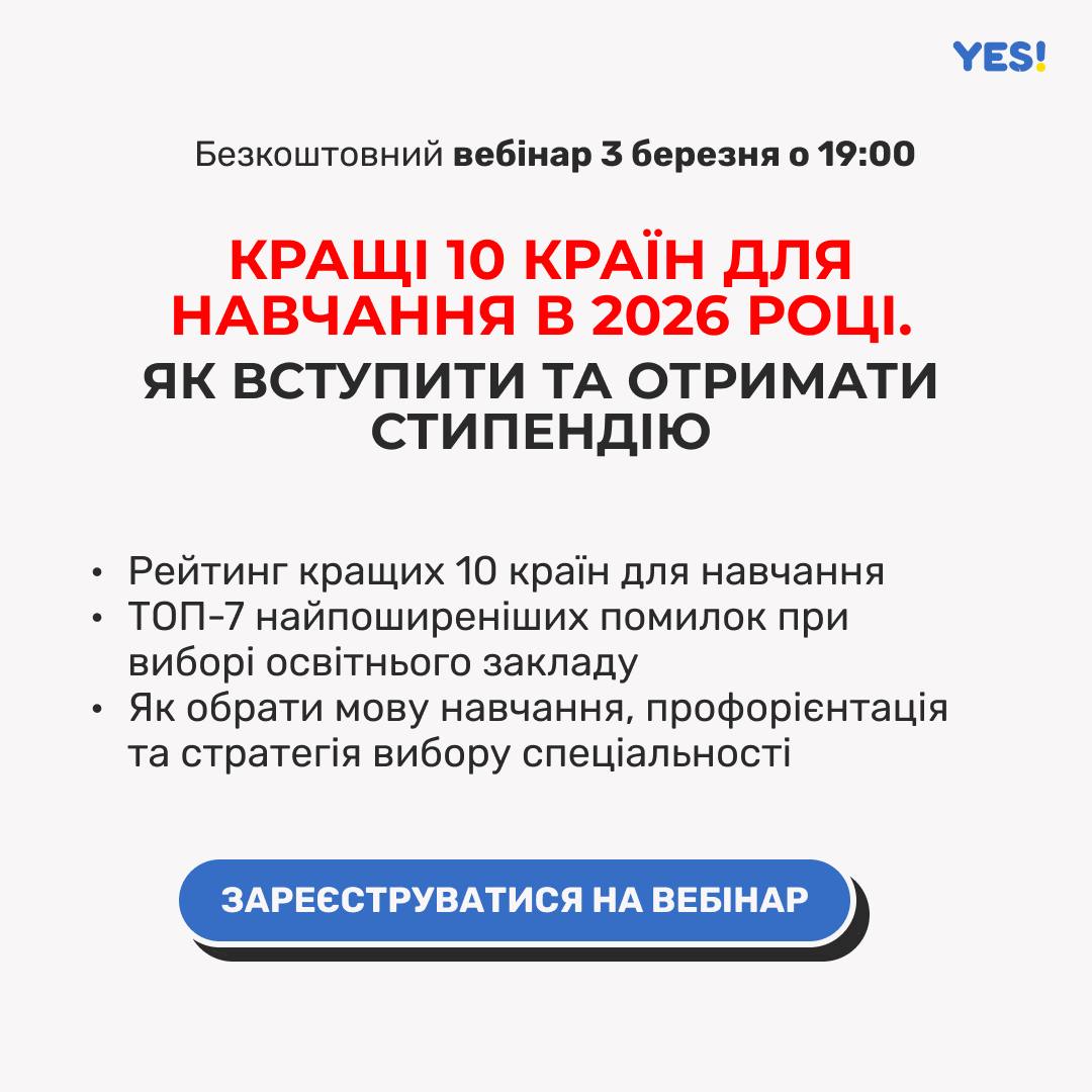 Запрошуємо на безкоштовний вебінар від YES Center «Кращі 10 країн для навчання в 2026 році. Як вступити та отримати стипендію»