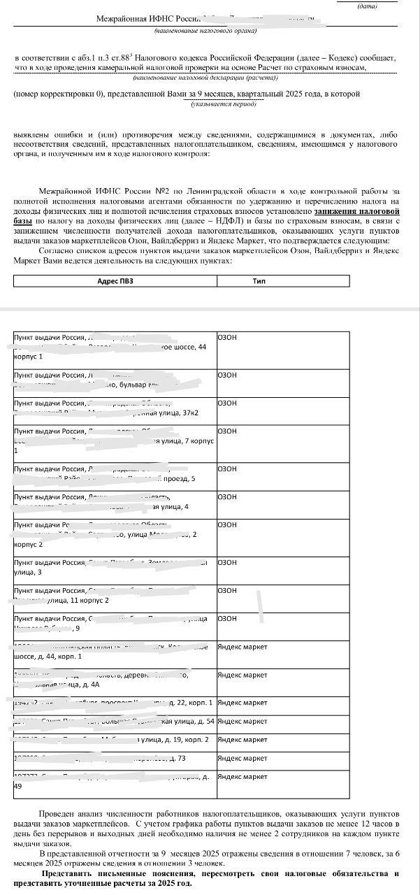 В начале 2026 года нашему клиенту, владельцу сети ПВЗ, прилетело сразу 3 требования: и по ООО, и по ИП. Суть всех была одна: по мнению ФНС, у него слишком мало сотрудников для имеющегося количества пунктов выдачи.