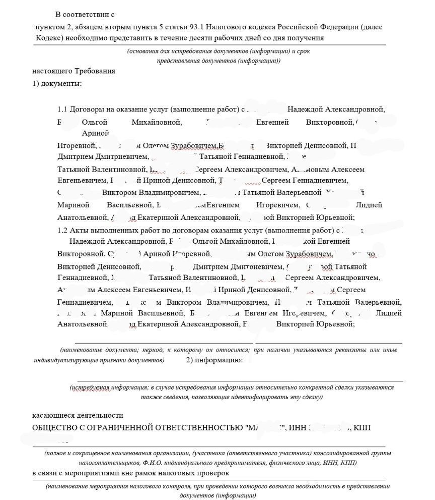 Требования по п. 2 ст. 93.1 НК РФ во время камеральной проверки - хорошая и постоянно действующая хитрость налоговых органов. Если в таких требованиях указаны конкретные контрагенты (например, самозанятые пофамильно), то формально они соответствуют п.2 ст.93.1 НК РФ, и являются правомерными. Прямых оснований отказать по такому требованию нет.