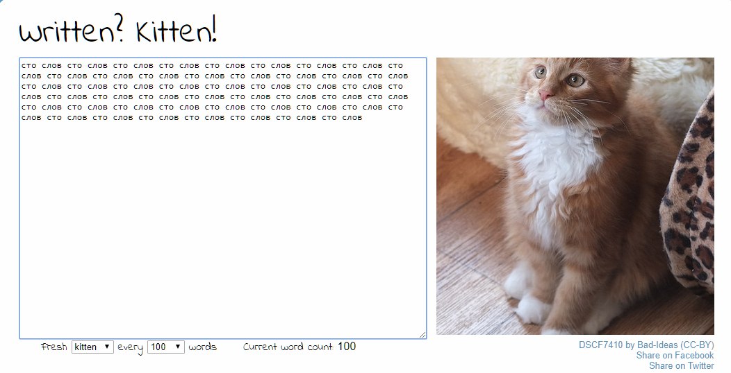 Смотрите какой сайт. Для котолюбов, которые должны что-то писать, но не могут заставить себя что-то писать. За каждые 100 написанных слов сайт награждает пишущего фотографией кота.