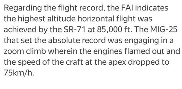 «Согласно Международной авиационной федерации (ФАИ), рекорд высоты в горизонтальном полете принадлежит сверхзвуковому разведчику SR-71 «Blackbird» и составляет 25,9 км. МИГ-25 установил абсолютный рекорд высоты полёта (37,7 км) выполняя «горку», во время чего в двигателях произошел срыв пламени, а скорость в самой высокой точке упала до 75 км/ч».
