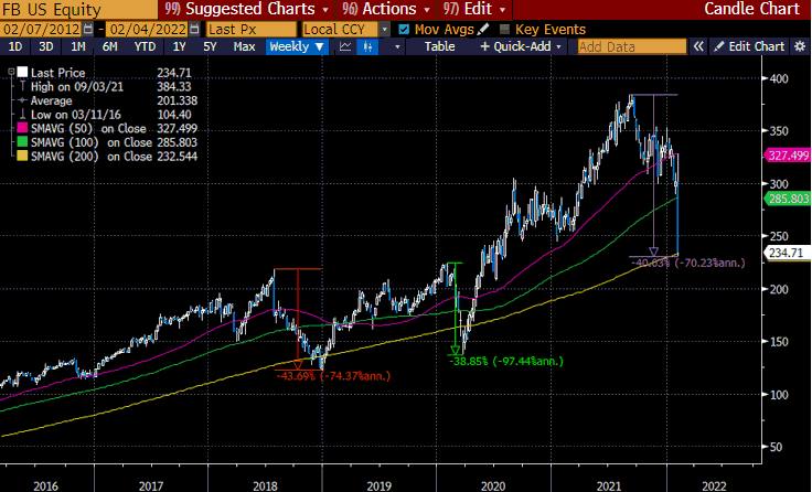 Триггером невиданного движения в бумаге стала слабая отчётность за четвертый квартал и относительно сдержанные ожидания менеджмента на 2022 год. Но главное разочарование – это, конечно, зафиксированное впервые в истории Facebook снижение количества ежедневных активных пользователей. Meta столкнулась с сильной конкуренцией со стороны TikTok в видеосегменте, пострадала от новых правил политики конфиденциальности Apple, а подразделение виртуальной реальности Reality Labs пока сгенерировало лишь убыток в размере 10 млрд долларов в 2021 году. В то же время коррекция бумаги с пика достигла 40% и уровня 200-недельной средней. Как говорится, if history is any guide, дно уже где-то поблизости (см. график ниже).