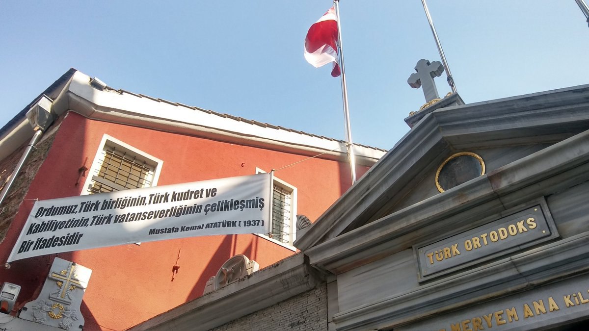 Баннер над Турецкой православной церковью в Стамбуле: "Турецкая армия это железное выражение турецких единства, силы и патриотизма" (Мустафа Кемаль, 1937).