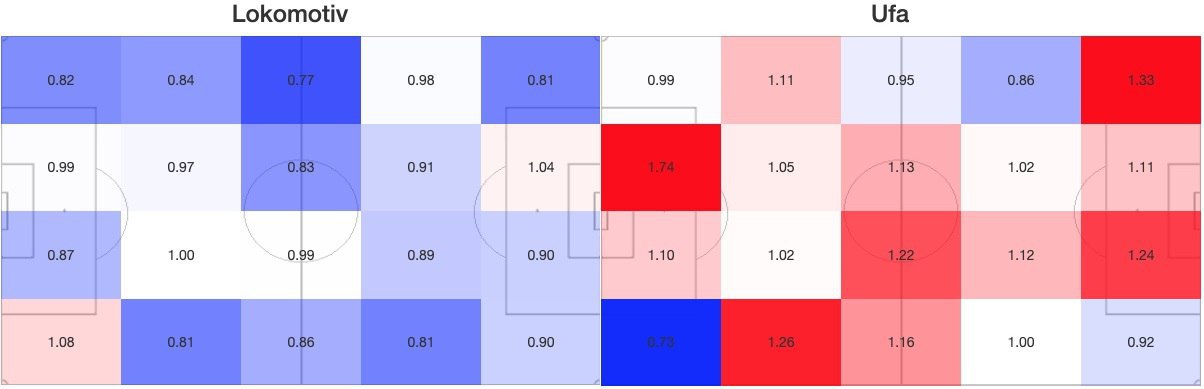 Если говорить про оборону, то может и будет лучше на копейку. Относительно среднего по лиге у Локо провисала зона правого защитника - и точность передач внутрь, и объем, и метры на потерю передачами и ранами (я взял только последнюю картинку, поскольку она в большей степени суммирующая - тоже самая по Уфе). У Уфы другая ситуация - они играют в 5 защитников с достаточно высокой средней линией. В таком случае правый вингбек больше отвечает за более высокий прямоугольник - как мы видим, эти зоны у Уфы провисали очень сильно (а зону, которая провисает у Локо, очень хорошо страховал Неделчару - ЦЗ вполне себе уровня верхней восьмерки и зоны Лиги Европы, лучший у Уфы наряду со Слаем).