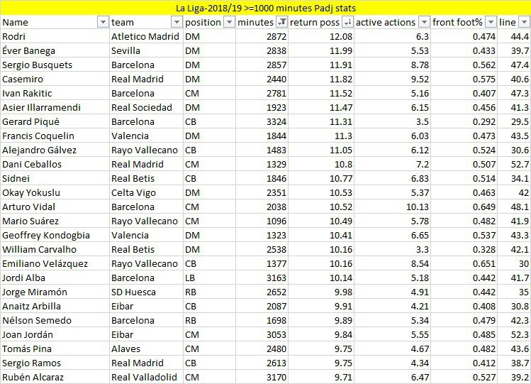 - он среди лидеров чемпионата Испании по padj возвратам владения p90. С большим объемом, процентом отборов 74 и достаточно большой средней координатой - 44.4. Возможно, лучший оборонительный полузащитник чемпионата.
