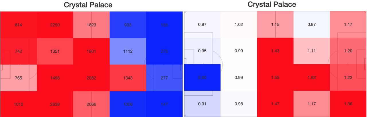 Вторая важная диаграмма - допущенные метры вперед на потерю (относительно среднего по лиге в этой зоне). Видно, что вплоть до своего среднего блока Кристал Пэлас позволяет сопернику хорошо продвигаться. Потом в среднем блоке справляются примерно на сопоставимом уровне во всех четырех зонах. И в низком, и в среднем блоке Ван-Биссака надежнее (пусть и несильно) Ван Анхольта на тему сдерживания продвижения соперника, но относительно лиги он не выделяется.
