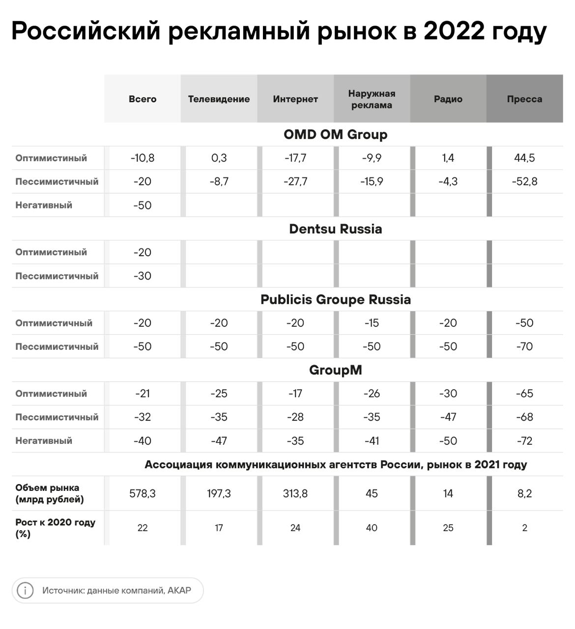 Четыре крупнейших рекламных группы России поделились своими прогнозами касаемо динамики развития отечественного рекламного рынка в 2022 году. Всего сценариев пять (можно глянуть тут), но выделяется два: в наиболее оптимистичном даже после падения рынок превысит показатели 2019 года и составит 515 млрд рублей, а вот в самом негативном провал может составить около 50%, до отметки в районе 289 млрд рублей. Последний раз такие цифры были 11 лет назад, в 2011 году.